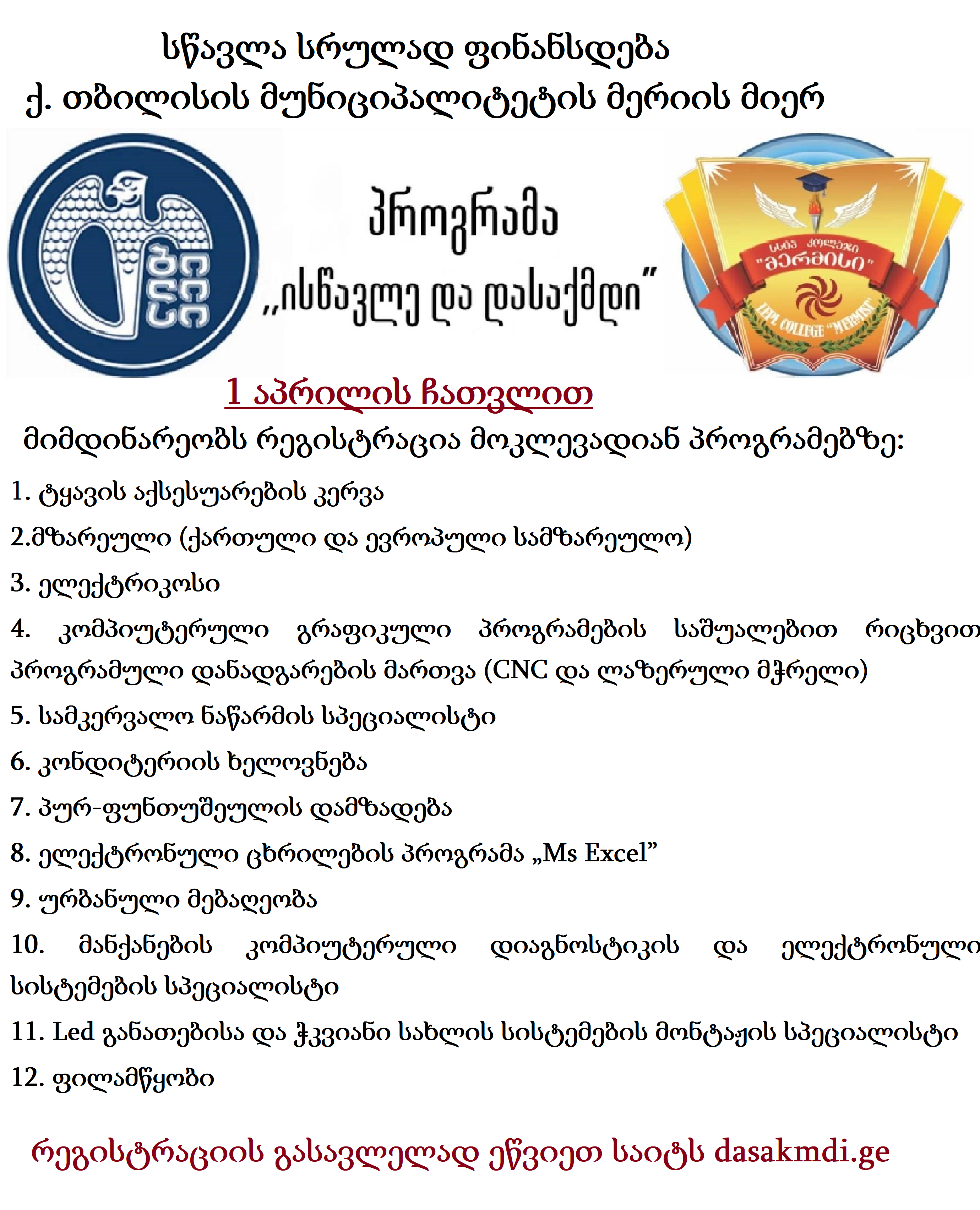 ქ. თბილისის მუნიციპალიტეტის მერიის პროექტის "ისწავლე და დასაქმდის" ფარგლებში დარეგისტრირებულ აპლიკანტთა საყურადღებოდ!!! წარმოგიდგენთ სსიპ კოლეჯის "მერმისი" მიერ განსახორციელებული მოკლევადიანი პროგრამების გასაუბრების განრიგს: